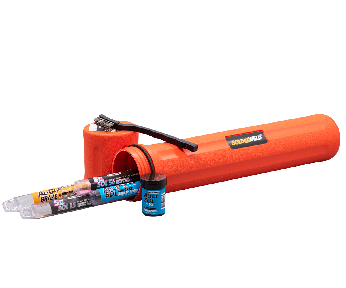 Alloy Sol Aluminum Repair and bonding Rods 5 pack - (weight 57.4g)Alloy Sol Flux for Aluminum soldering 1 oz tub (50.1g)Al-Cop Braze rods 5 pack - Aluminum to Copper brazing (75.4g)Sil-Sol 56% Silver Solder flux covered rods 2 pack - (54.9g)Stainless Steel Wire Brush - (24.4g)Orange Watertight Carrying Canister - (376.5g)